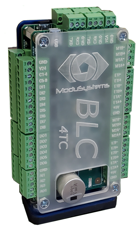 The BLC-4TC is a 4 Axis Pulse/Dir or Quadrature Controller capable of controlling digital servo drives or external stepper drives. The BLC family of controllers were designed to be a Cost Effective OEM solution for Motion & Machine Control. Each Module has 4-axes that are internally coordinated; but with the dual RS232 serial ports, multiple units can be daisy chained together for higher axis count applications. All axes are detected and their resources are available during programming without needing to connect to each unit individually.