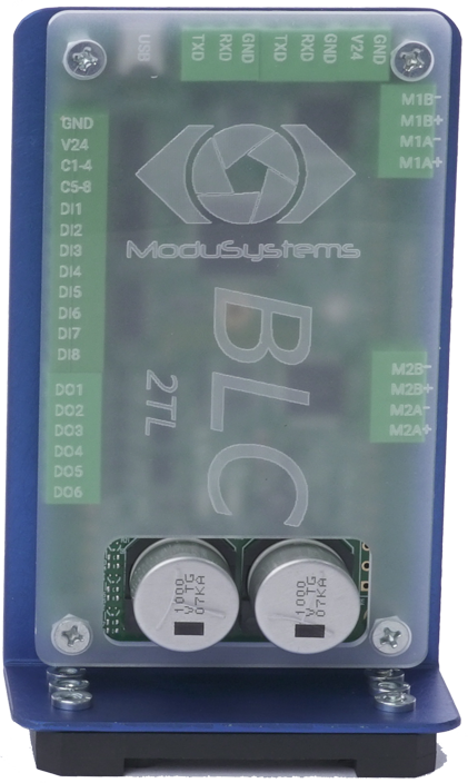 The BLC-2TL is a Dual Axis Modular Stepper Motor Controller with Integrated Amplifiers most appropriates sized to drive smaller stepper motors (NEMA 06 through NEMA 23). The BLC family of controllers were designed to be a Cost Effective OEM solution for Motion & Machine Control. Each Module has 2-axes that are internally coordinated; but with the dual RS232 serial ports, multiple units can be daisy chained together for higher axis count applications. All axes are detected and their resources are available during programming without needing to connect to each unit individually.