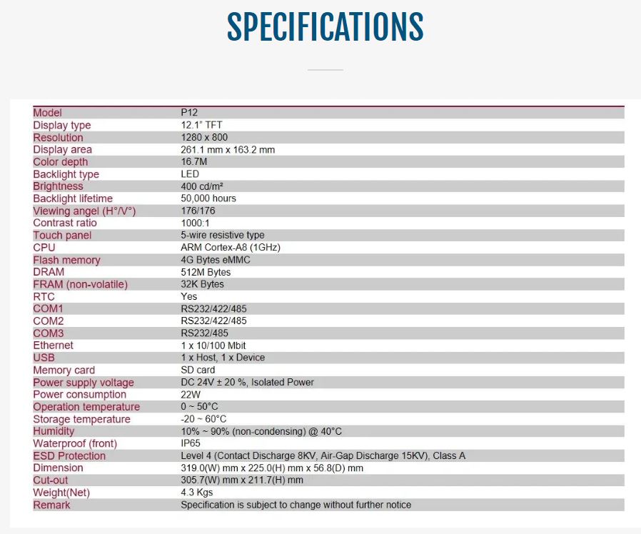 - 12.1”, 1280×800 TFT with 5-wire touch panel, Aluminum front bezel & steel chassis