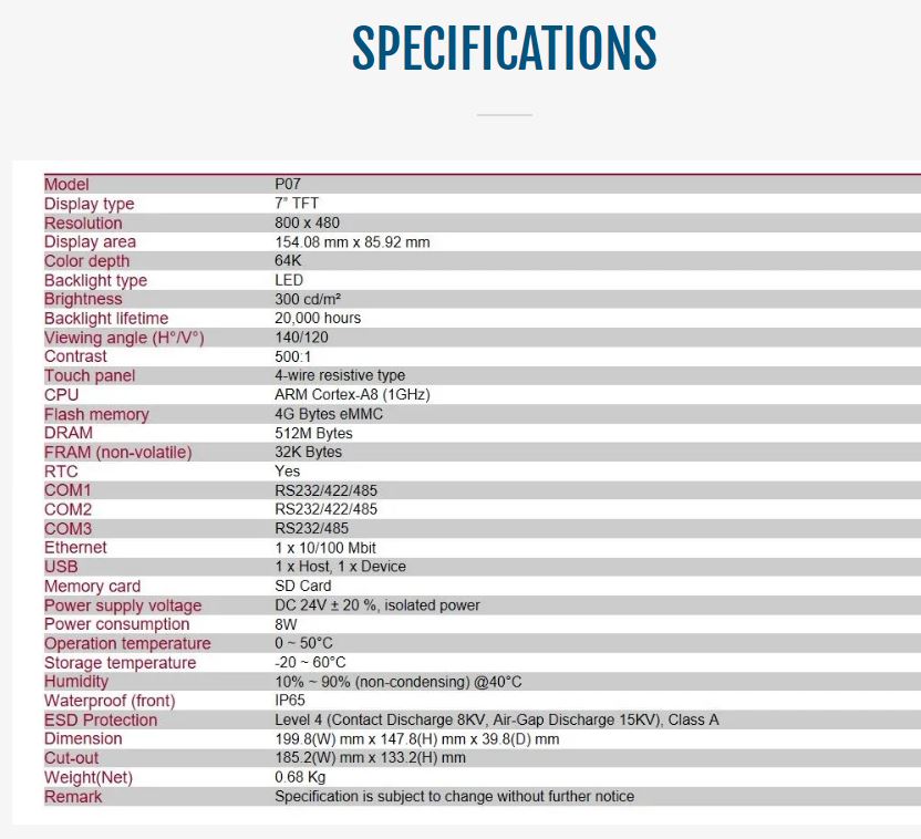 - 7″, 800×480 TFT with 4-wire touch panel