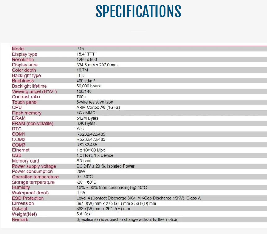 - 15.4”, 1280×800 TFT with 5-wire touch panel, Aluminum front bezel & steel chassis