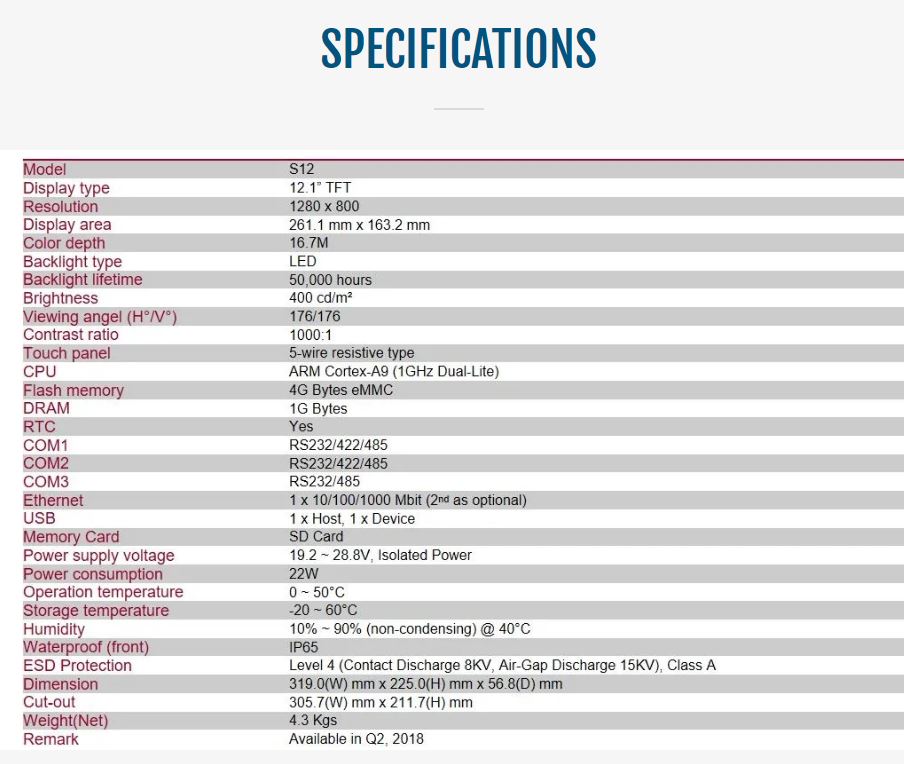 - 12.1″, 1280×800 TFT with 5-wire touch panel, aluminum front bezel & steel chassis