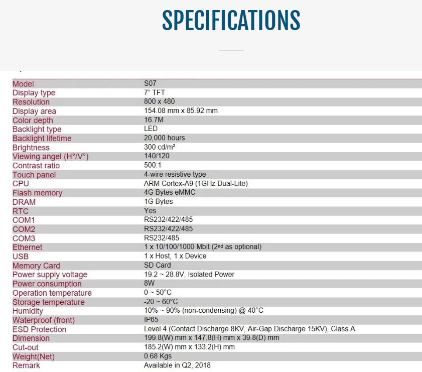 - 7″, 800×480 TFT with 4-wire touch panel