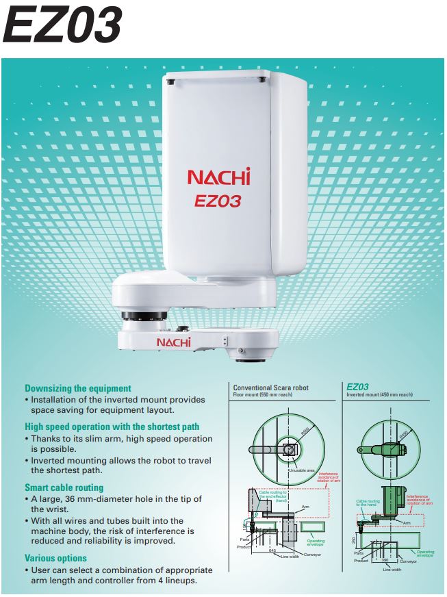 The EZ SCARA Robot Series consists of 4-Axis (EZ03) models and is available in both floor and invert mounted configurations with a variety of reach and stroke options available. This high speed robot series is excellent for material handling, assembly, electronics, and palletizing applications.